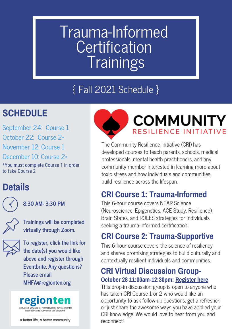 All training will happen virtually through zoom and is open to members of the public. Preregistration is required through eventbrite. For questions please email MHFA@regionten.org.
